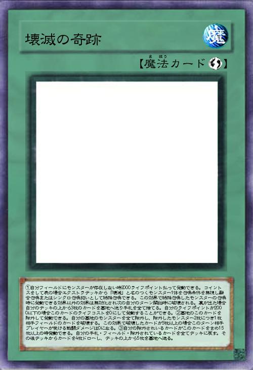 | ①自分フィールドにモンスターが存在しない時2000ライフポイント払って発動できる。コイントスをして表の場合エクストラデッキから「壊滅」と名のつくモンスター1体を召喚条件を無視し融合召喚またはシンクロ召喚扱いとして特殊召喚できる。この効果で特殊召喚したモンスターの召喚時に発動できる効果以外の効果は無効化され次の自分のターン開始時に破壊される。裏が出た場合自分のデッキの上から3枚のカードを墓地へ送り手札を全て捨てる。自分のライフポイントが2000以下の場合このカードのライフコストを0にして発動することができる。②墓地のこのカードを除外して発動できる。自分の墓地のモンスターを全て除外し、除外したモンスター2枚につき1枚相手フィールドのカードを破壊する。この効果で破壊したカードが3枚以上の場合このターン相手プレイヤーが受ける戦闘ダメージは0になる。③自分の除外されいるカードがこのカードを含め15枚 | |||