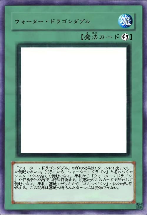 | 「ウォーター・ドラゴンダブル」の①の効果は1ターンに1度までしか発動できない。①手札から「ウォーター・ドラゴン」と名のつくモンスター1体を捨てて発動できる。手札から「ウォーター・ドラゴン」を召喚条件を無視し特殊召喚する。②墓地のこのカードを除外して発動できる。手札・墓地・デッキから「オキシゲドン」1体を特殊召喚する。この効果は墓地へ送られたターンには発動できない。 | |||