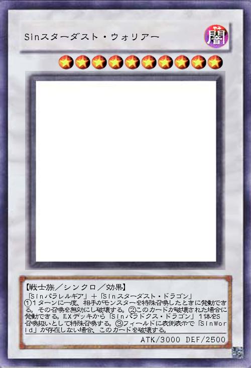 「Sin化したスターダスト・ウォリアー。シンクロ素材はパラレルギアとSinスターダストに固定され、モンスターの特殊召喚を無効にし破壊する効果持ち。破壊されるとパラドクス・ドラゴンを特殊召喚します。」(2019-03-02 11:51)