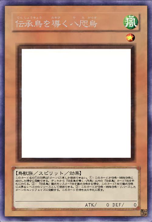 | このカード名の①の効果は1ターンに1度しか使用できない。①:このカードが召喚・特殊召喚に成功した場合に発動できる。デッキから「伝承鳥を導く八咫烏」以外の「伝承鳥」カード1枚を手札に加える。②:「伝承鳥」儀式モンスター1体を儀式召喚する場合、このカード1枚で儀式召喚に必要なレベル分のリリースとして使用できる。③:このカードが召喚・特殊召喚・リバースしたターンのエンドフェイズに発動する。このカードを持ち主の手札に戻す。 | |||