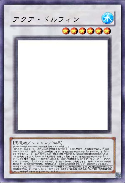 | チューナー+チューナー以外の海竜族モンスター1体以上 「アクア・ドルフィン」の①と③の効果はそれぞれ1ターンに1度までしか発動できない。①このカードがシンクロ召喚に成功した時発動できる。墓地またはデッキから「ウォーター」と「ドラゴン」を含むチューナー以外のモンスター1体を特殊召喚できる。②この効果は特殊召喚されたターンには発動できない。1ターンに1度手札を1枚捨てて発動できる。墓地またはデッキから「ボンディング」魔法・罠カード1枚を手札に加える。③自分の墓地から「アクア・マジック」「アクア・パニッシャー」「アクア・トルネード」を1枚ずつ除外して発動できる。相手フィールドの表側表示のカードを3枚まで破壊し、破壊したカード1枚につき相手プレイヤーに500ポイントのダメージを与える。④このカードが相手ターンの戦闘または相手の効果によって破壊または除外された時発動できる。デッキから「ハイドロゲドン | |||