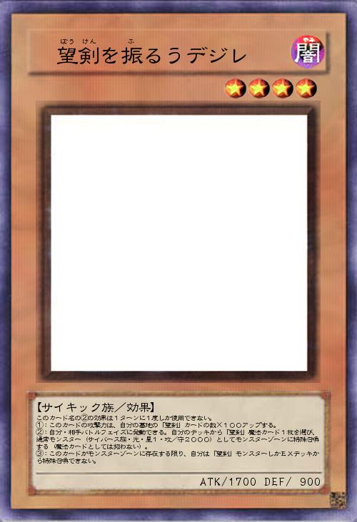 | このカード名の②の効果は1ターンに1度しか使用できない。 ①:このカードの攻撃力は、自分の墓地の「望剣」カードの数×100アップする。 ②:自分・相手バトルフェイズに発動できる。自分のデッキから「望剣」魔法カード1枚を選び、通常モンスター(サイバース族・光・星1・攻/守2000)としてモンスターゾーンに特殊召喚する(魔法カードとしては扱わない)。 ③:このカードがモンスターゾーンに存在する限り、自分は「望剣」モンスターしかEXデッキから特殊召喚できない。 | |||