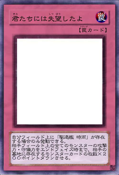| 自分フィールド上に「駆逐艦 時雨」が存在する場合のみ発動できる。 相手フィールド上の全てのモンスターの攻撃力・守備力をエンドフェイズ時まで、相手の墓地に存在するモンスターカードの枚数×200ポイントダウンさせる。 | |||