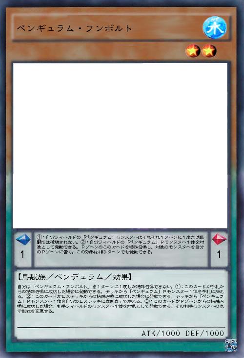 | 自分は「ペンギュラム・フンボルト」を1ターンに1度しか特殊召喚できない。①:このカードが手札からの特殊召喚に成功した場合に発動できる。デッキから「ペンギュラム」Pモンスター1体を手札に加える。②:このカードがEXデッキからの特殊召喚に成功した場合に発動できる。デッキから「ペンギュラム」Pモンスター1体を自分のEXデッキに表側表示で加える。③:このカードがPゾーンからの特殊召喚に成功した場合、相手フィールドのモンスター1体を対象として発動できる。その相手モンスターの表示形式を変更する。 | |||