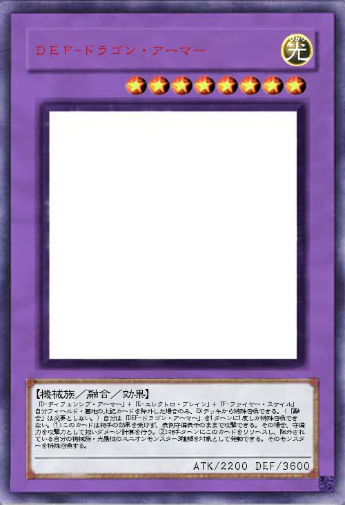 | 「D-ディフェンシブ・アーマー」+「E-エレクトロ・ブレイン」+「F-ファイヤー・スケイル」 自分フィールド・墓地の上記カードを除外した場合のみ、EXデッキから特殊召喚できる。(「融合」は必要としない。) 自分は「DEF-ドラゴン・アーマー」を1ターンに1度しか特殊召喚できない。①:このカードは相手の効果を受けず、表側守備表示のままで攻撃できる。その場合、守備力を攻撃力として扱いダメージ計算を行う。②:相手ターンにこのカードをリリースし、除外されている自分の機械族・光属性のユニオンモンスター3種類を対象として発動できる。そのモンスターを特殊召喚する。 | |||