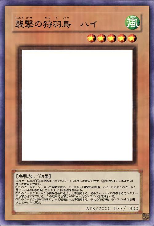 | このカード名の①②の効果はそれぞれ1ターンに1度しか使用できず、③の効果はデュエル中に1度しか使用できない。 ①このカードをリリースして発動できる。デッキから「襲撃の狩羽鳥 ハイ」以外のこのカードと同じレベルの「狩羽鳥」モンスター1体を特殊召喚する。 ②このカードがデッキから特殊召喚に成功した時発動する。相手フィールドに存在するモンスターの攻撃力を1000下げる。この効果で攻撃力が0になったモンスターは破壊される。 ③このカードが相手の効果によって破壊された時発動する。手札の「狩羽鳥」モンスター1体を選択してデッキに戻す。 | |||