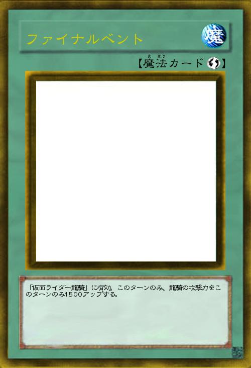 | 「仮面ライダー龍騎」に有効。このターンのみ、龍騎の攻撃力をこのターンのみ1500アップする。 | |||