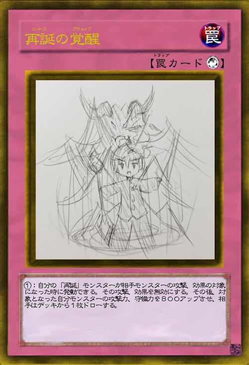 | ①:自分の「再誕」モンスターが相手モンスターの攻撃、効果の対象になった時に発動できる。その攻撃、効果を無効にする。その後、対象となった自分モンスターの攻撃力、守備力を800アップさせ、相手はデッキから1枚ドローする。 | |||