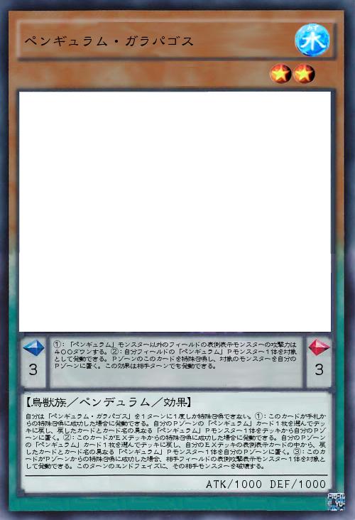 | 自分は「ペンギュラム・ガラパゴス」を1ターンに1度しか特殊召喚できない。①:このカードが手札からの特殊召喚に成功した場合に発動できる。自分のPゾーンの「ペンギュラム」カード1枚を選んでデッキに戻し、戻したカードとカード名の異なる「ペンギュラム」Pモンスター1体をデッキから自分のPゾーンに置く。②:このカードがEXデッキからの特殊召喚に成功した場合に発動できる。自分のPゾーンの「ペンギュラム」カード1枚を選んでデッキに戻し、自分のEXデッキの表側表示カードの中から、戻したカードとカード名の異なる「ペンギュラム」Pモンスター1体を自分のPゾーンに置く。③:このカードがPゾーンからの特殊召喚に成功した場合、相手フィールドの表側攻撃表示モンスター1体を対象として発動できる。このターンのエンドフェイズに、その相手モンスターを破壊する。 | |||