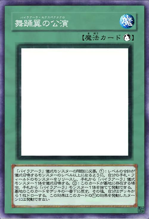 | 「バイラアーラ」儀式モンスターの降臨に必要。①:レベルの合計が儀式召喚するモンスターのレベル以上になるように、自分の手札・フィールドのモンスターをリリースし、手札から「バイラアーラ」儀式モンスター1体を儀式召喚する。②:このカードが墓地に存在する場合、手札から「バイラアーラ」モンスター1体を捨てて発動できる。墓地のこのカードをデッキの一番下に戻す。その後、自分はデッキから1枚ドローする。この効果はこのカードの①の効果を発動したターンには発動できない | |||