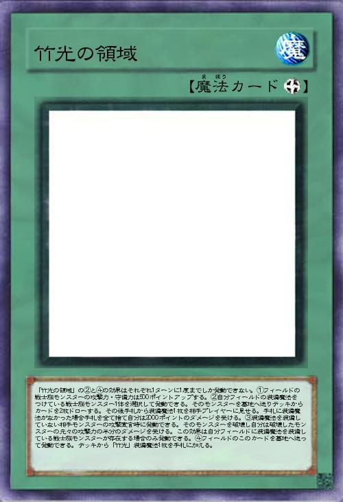| 「竹光の領域」の②と④の効果はそれぞれ1ターンに1度までしか発動できない。①フィールドの戦士族モンスターの攻撃力・守備力は500ポイントアップする。②自分フィールドの装備魔法をつけている戦士族モンスター1体を選択して発動できる。そのモンスターを墓地へ送りデッキからカードを2枚ドローする。その後手札から装備魔法1枚を相手プレイヤーに見せる。手札に装備魔法がなかった場合手札を全て捨て自分は2000ポイントのダメージを受ける。③装備魔法を装備していない相手モンスターの攻撃宣言時に発動できる。そのモンスターを破壊し自分は破壊したモンスターの元々の攻撃力の半分のダメージを受ける。この効果は自分フィールドに装備魔法を装備している戦士族モンスターが存在する場合のみ発動できる。④フィールドのこのカードを墓地へ送って発動できる。デッキから「竹光」装備魔法1枚を手札に加える。 | |||