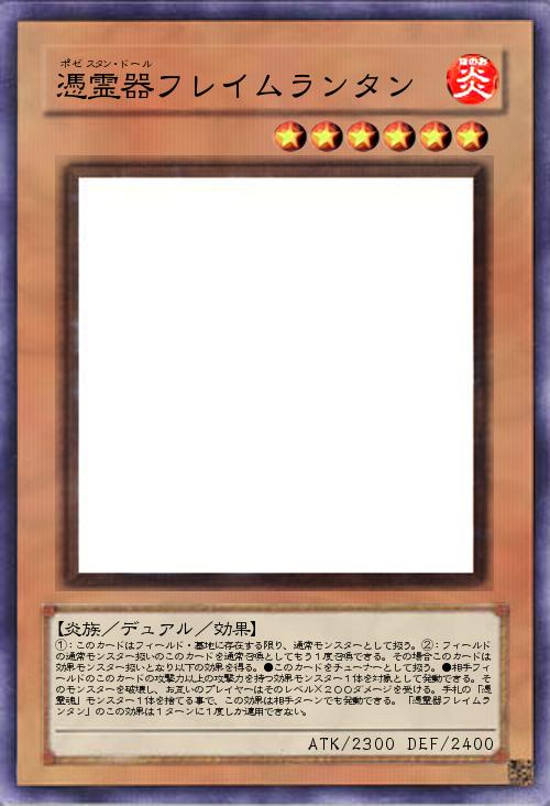| ①:このカードはフィールド・墓地に存在する限り、通常モンスターとして扱う。②:フィールドの通常モンスター扱いのこのカードを通常召喚としてもう1度召喚できる。その場合このカードは効果モンスター扱いとなり以下の効果を得る。●このカードをチューナーとして扱う。●相手フィールドのこのカードの攻撃力以上の攻撃力を持つ効果モンスター1体を対象として発動できる。そのモンスターを破壊し、お互いのプレイヤーはそのレベル×200ダメージを受ける。手札の「憑霊魂」モンスター1体を捨てる事で、この効果は相手ターンでも発動できる。「憑霊器フレイムランタン」のこの効果は1ターンに1度しか適用できない。 | |||
