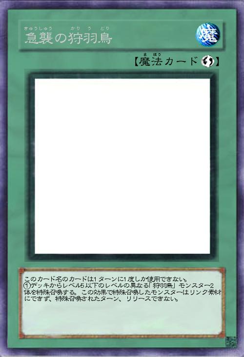 | このカード名のカードは1ターンに1度しか使用できない。 ①デッキからレベル5以下のレベルの異なる「狩羽鳥」モンスター2体を特殊召喚する。この効果で特殊召喚したモンスターはリンク素材にできず、特殊召喚されたターン、リリースできない。 | |||
