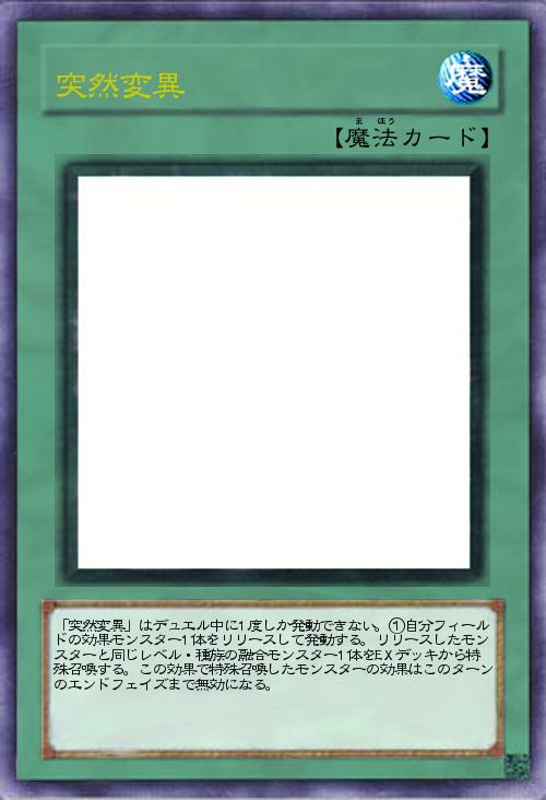 | 「突然変異」はデュエル中に1度しか発動できない。①自分フィールドの効果モンスター1体をリリースして発動する。リリースしたモンスターと同じレベル・種族の融合モンスター1体をEXデッキから特殊召喚する。この効果で特殊召喚したモンスターの効果はこのターンのエンドフェイズまで無効になる。 | |||