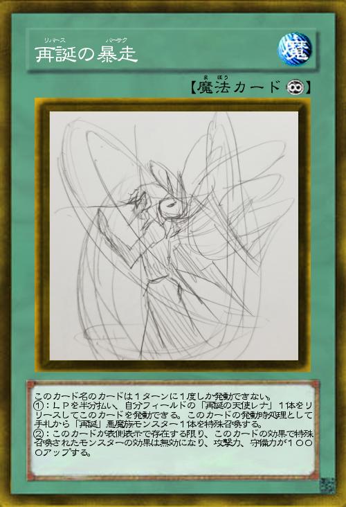 | このカード名のカードは1ターンに1度しか発動できない。 ①:LPを半分払い、自分フィールドの「再誕の天使レナ」1体をリリースしてこのカードを発動できる。このカードの発動時処理として手札から「再誕」悪魔族モンスター1体を特殊召喚する。 ②:このカードが表側表示で存在する限り、このカードの効果で特殊召喚されたモンスターの効果は無効になり、攻撃力、守備力が1000アップする。 | |||