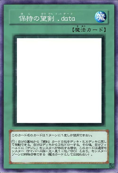| このカード名のカードは1ターンに1度しか使用できない。 ①:自分の墓地から「望剣」カード5枚をデッキ・EXデッキに戻して発動できる。自分はデッキから2枚ドローする。その後、自分フィールドに「デジレ」モンスターが存在する場合、このカードは通常モンスター(サイバース族・光・星1・攻/守0)となり、モンスターゾーンに特殊召喚できる(魔法カードとしては扱わない)。 | |||