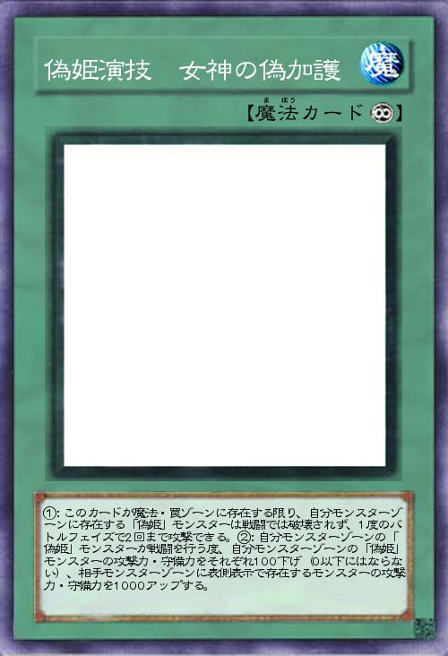 | ①:このカードが魔法・罠ゾーンに存在する限り、自分モンスターゾーンに存在する「偽姫」モンスターは戦闘では破壊されず、1度のバトルフェイズで2回まで攻撃できる。②:自分モンスターゾーンの「偽姫」モンスターが戦闘を行う度、自分モンスターゾーンの「偽姫」モンスターの攻撃力・守備力をそれぞれ100下げ(0以下にはならない)、相手モンスターゾーンに表側表示で存在するモンスターの攻撃力・守備力を1000アップする。 | |||