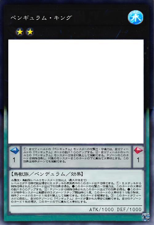 | 水属性・鳥獣族レベル2モンスター2体以上(最大5体まで) レベル2がP召喚可能な場合にEXデッキの表側表示のこのカードはP召喚できる。①:EXデッキから特殊召喚されたこのカードは以下の効果を得る。●このカードの攻撃力・守備力は、このカードのX素材の数×500アップする。②:Pゾーンから特殊召喚されたこのカードは以下の効果を得る。●このカードが相手モンスターと戦闘を行うダメージステップ開始時に1度、このカードのX素材を1つ取り除き、相手フィールドのカード1枚を対象として発動できる。そのカードを破壊する。③:このカードがフィールドに存在し、自分のPゾーンに「ペンギュラム」カードが置かれた場合に発動できる。自分のPゾーンのカード1枚を選び、このカードの下に重ねてX素材とする。 | |||