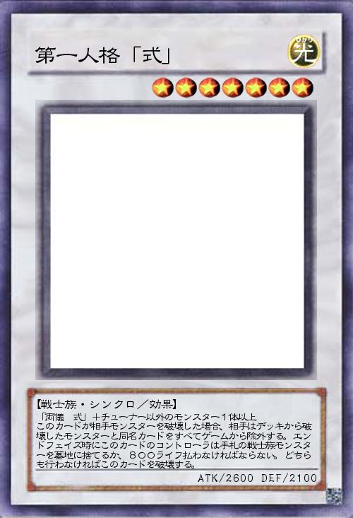 「両儀 式」+チューナー以外のモンスター1体以上 このカードが相手モンスターを破壊した場合、相手はデッキから破壊したモンスターと同名カードをすべてゲームから除外する。エンドフェイズ時にこのカードのコントローラは手札の戦士族モンスターを墓地に捨てるか、800ライフ払わなければならない。どちらも行わなければこのカードを破壊する。 |