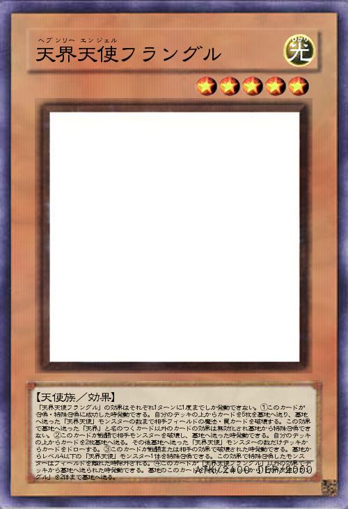 | 「天界天使フラングル」の効果はそれぞれ1ターンに1度までしか発動できない。①このカードが召喚・特殊召喚に成功した時発動できる。自分のデッキの上からカードを5枚を墓地へ送り、墓地へ送った「天界天使」モンスターの数まで相手フィールドの魔法・罠カードを破壊する。この効果で墓地へ送った「天界」と名のつくカード以外のカードの効果は無効化され墓地から特殊召喚できない。②このカードが戦闘で相手モンスターを破壊し、墓地へ送った時発動できる。自分のデッキの上からカードを2枚墓地へ送る。その後墓地へ送った「天界天使」モンスターの数だけデッキからカードをドローする。③このカードが戦闘または相手の効果で破壊された時発動できる。墓地からレベル4以下の「天界天使」モンスター1体を特殊召喚できる。この効果で特殊召喚したモンスターはフィールドを離れた時除外される。④このカードが「天界天使フラングル」以外の効果でデッキから | |||