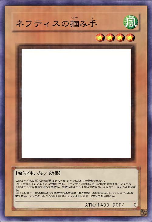 | このカード名の(1)(2)の効果はそれぞれ1ターンに1度しか発動できない。 (1):自分メインフェイズに発動できる。 「ネフティスの掴み手」以外の自分の手札・フィールドのカードを2枚まで選んで破壊し、破壊したカード1枚につき2つ、このカードのレベルを上げる。 (2):このカードが効果によって破壊され墓地に送られた場合、次の自分スタンバイフェイズに発動できる。デッキからレベル4以下の「ネフティス」モンスター1体を手札に加える。 | |||