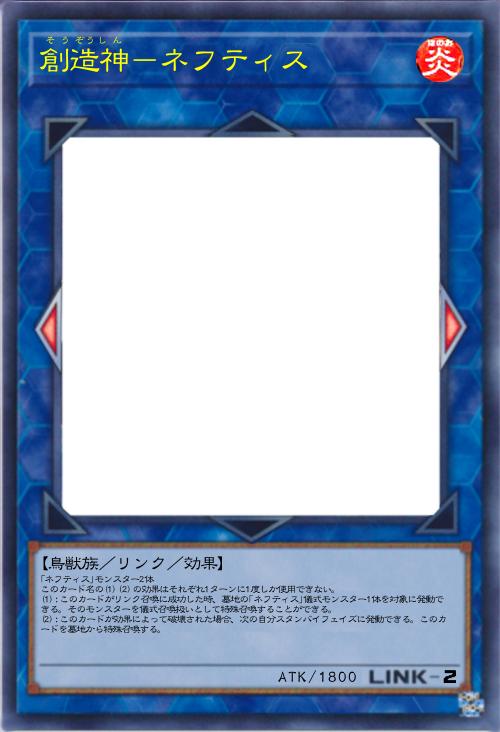 | 「ネフティス」モンスター2体 このカード名の(1)(2)の効果はそれぞれ1ターンに1度しか使用できない。 (1):このカードがリンク召喚に成功した時、墓地の「ネフティス」儀式モンスター1体を対象に発動できる。そのモンスターを儀式召喚扱いとして特殊召喚することができる。 (2):このカードが効果によって破壊された場合、次の自分スタンバイフェイズに発動できる。このカードを墓地から特殊召喚する。 | |||