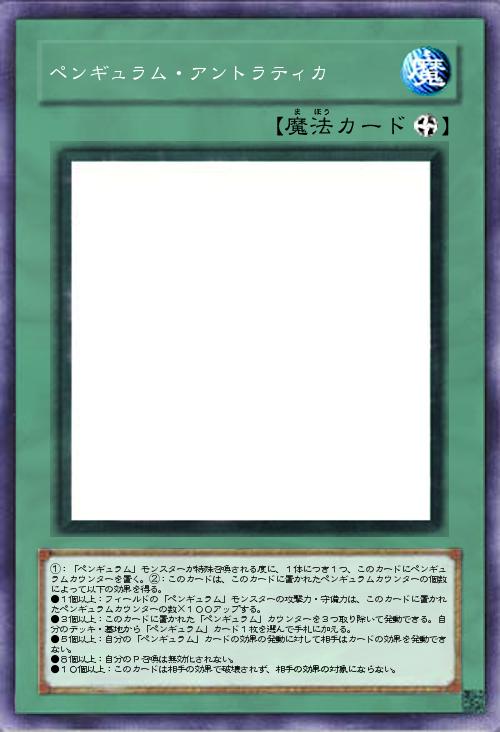 | ①:「ペンギュラム」モンスターが特殊召喚される度に、1体につき1つ、このカードにペンギュラムカウンターを置く。②:このカードは、このカードに置かれたペンギュラムカウンターの個数によって以下の効果を得る。 ●1個以上:フィールドの「ペンギュラム」モンスターの攻撃力・守備力は、このカードに置かれたペンギュラムカウンターの数×100アップする。 ●3個以上:このカードに置かれた「ペンギュラム」カウンターを3つ取り除いて発動できる。自分のデッキ・墓地から「ペンギュラム」カード1枚を選んで手札に加える。 ●5個以上:自分の「ペンギュラム」カードの効果の発動に対して相手はカードの効果を発動できない。 ●8個以上:自分のP召喚は無効化されない。 ●10個以上:このカードは相手の効果で破壊されず、相手の効果の対象にならない。 | |||