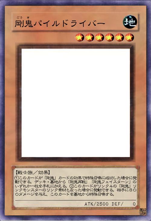| ①このカードが「剛鬼」カードの効果で特殊召喚に成功した場合に発動できる。デッキ・墓地から「剛鬼再戦」「剛鬼フェイスターン」のいずれか一枚を手札に加える。②このカードがリンク4の「剛鬼」リンクモンスターのリンク素材となった場合に発動できる。相手に800ダメージを与え、このカードを墓地から特殊召喚する。 | |||