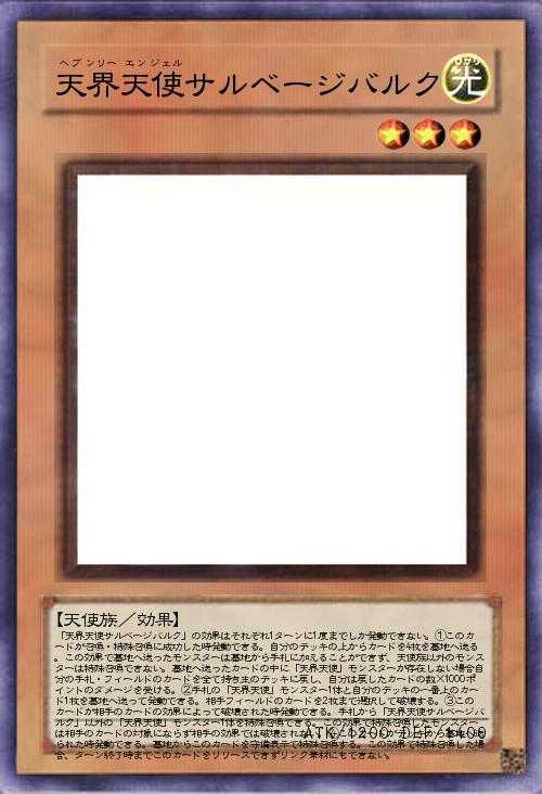| 「天界天使サルベージバルク」の効果はそれぞれ1ターンに1度までしか発動できない。①このカードが召喚・特殊召喚に成功した時発動できる。自分のデッキの上からカードを4枚を墓地へ送る。この効果で墓地へ送ったモンスターは墓地から手札に加えることができず、天使族以外のモンスターは特殊召喚できない。墓地へ送ったカードの中に「天界天使」モンスターが存在しない場合自分の手札・フィールドのカードを全て持ち主のデッキに戻し、自分は戻したカードの数×1000ポイントのダメージを受ける。②手札の「天界天使」モンスター1体と自分のデッキの一番上のカード1枚を墓地へ送って発動できる。相手フィールドのカードを2枚まで選択して破壊する。③このカードが相手のカードの効果によって破壊された時発動できる。手札から「天界天使サルベージバルク」以外の「天界天使」モンスター1体を特殊召喚できる。この効果で特殊召喚したモンスターは相手 | |||