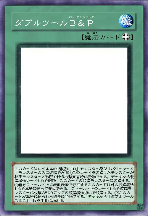 | このカードはレベル4の機械族「D」モンスター及び「パワーツール」モンスターのみに装備できる①このカードを装備したモンスターが相手モンスターと戦闘を行う攻撃宣言時に発動できる。デッキから装備魔法カード1枚を選び、このカードの装備モンスターに装備する。②自分フィールド上に表側表示で存在するこのカード以外の装備魔法1枚を墓地に送って発動できる。フィールド上のカード1枚を装備モンスターに攻撃力500アップの装備魔法扱いで装備する。③このカードが墓地に送られた場合に発動できる。デッキから「ダブルツールD&C」1枚を手札に加える。 | |||