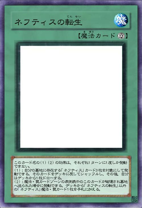 | このカード名の(1)(2)の効果は、それぞれ1ターンに1度しか発動できない。 (1):自分の墓地に存在する「ネフティス」カード3枚を対象にして発動できる。そのカードをデッキに戻してシャッフルし、その後、自分はデッキから1枚ドローする。 (2):魔法・罠カードゾーンの表側表示のこのカードが破壊され墓地へ送られた場合に発動できる。デッキから「ネフティスの転生」以外の「ネフティス」魔法・罠カード1枚を手札に加える。 | |||