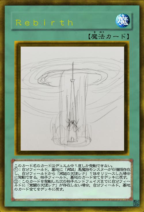 | このカード名のカードはデュエル中1度しか発動できない。 ①:自分フィールド、墓地に「再誕」悪魔族モンスターが6種類存在し、自分フィールドから「再誕の天使レナ」1体をリリースした場合に発動できる。相手フィールド、墓地のカード全てをデッキに戻す。 ②:このカードを発動した次の相手エンドフェイズまでに自分フィールドに「覚醒の天使レナ」が存在しない場合、自分フィールド、墓地のカード全てをデッキに戻す。 | |||