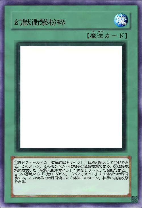 「有翼幻獣キマイラの必殺技をカードにしました。キマイラに直接攻撃できるようにするためのカードで直接攻撃に成功すると自身をリリースして融合素材2体を直接攻撃できるようにして蘇生させます。3体の直接攻撃が通れば合計でライフ5000は削れます。」(2019-03-16 22:55)