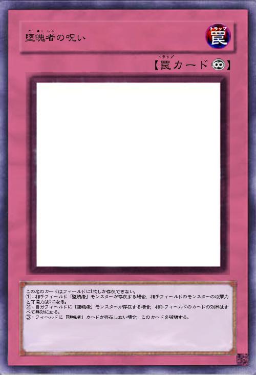 | この名のカードはフィールドに1枚しか存在できない。 ①:相手フィールド「堕魄者」モンスターが存在する場合,相手フィールドのモンスターの攻撃力と守備力は0になる。 ②:自分フィールドに「堕魄者」モンスターが存在する場合,相手フィールドのカードの効果はすべて無効になる。 ③:フィールドに「堕魄者」カードが存在しない場合,このカードを破壊する。 | |||
