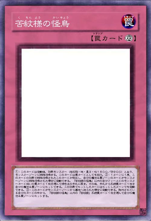 | ①:このカードは発動後、効果モンスター(岩石族・地・星3・攻1500/守900)となり、モンスターゾーンに特殊召喚する。このカードは罠カードとしても扱う。②:1ターンに1度、このカードの効果で特殊召喚されたこのカードが存在し、自分の魔法&罠ゾーンのカードがモンスターゾーンに特殊召喚された場合に発動できる。「苦紋様の怪鳥」以外の自分フィールドのモンスターカード扱いの罠カード1枚を選んで持ち主の手札に戻す。その後、手札から永続罠カード1枚を自分の魔法&罠ゾーンにセットできる。この効果でセットしたカードはセットしたターンでも発動できる。③:このカードがモンスターゾーンから墓地へ送られた場合に発動できる。除外されている自分のカードの中から、「苦紋様の怪鳥」以外の「苦紋様」永続罠カード1枚を選んで自分の魔法&罠ゾーンにセットする。 | |||