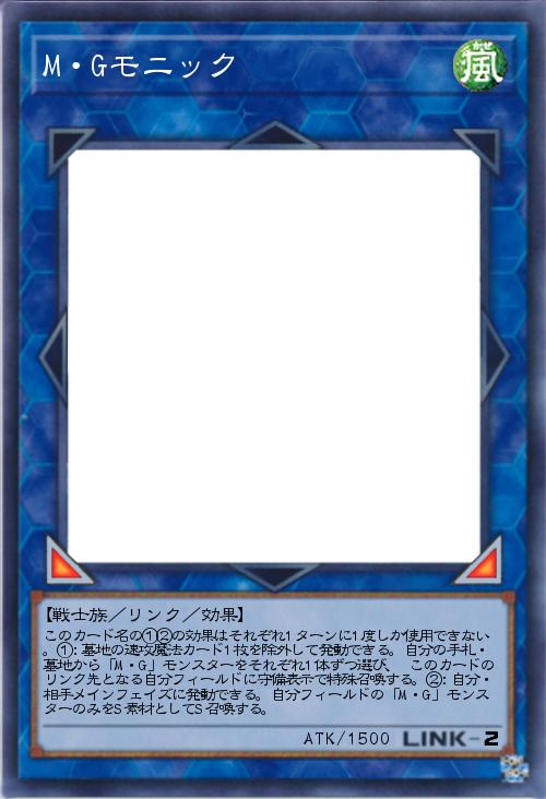| このカード名の①②の効果はそれぞれ1ターンに1度しか使用できない。①:墓地の速攻魔法カード1枚を除外して発動できる。自分の手札・墓地から「M・G」モンスターをそれぞれ1体ずつ選び、 このカードのリンク先となる自分フィールドに守備表示で特殊召喚する。②:自分・相手メインフェイズに発動できる。自分フィールドの「M・G」モンスターのみをS素材としてS召喚する。 | |||