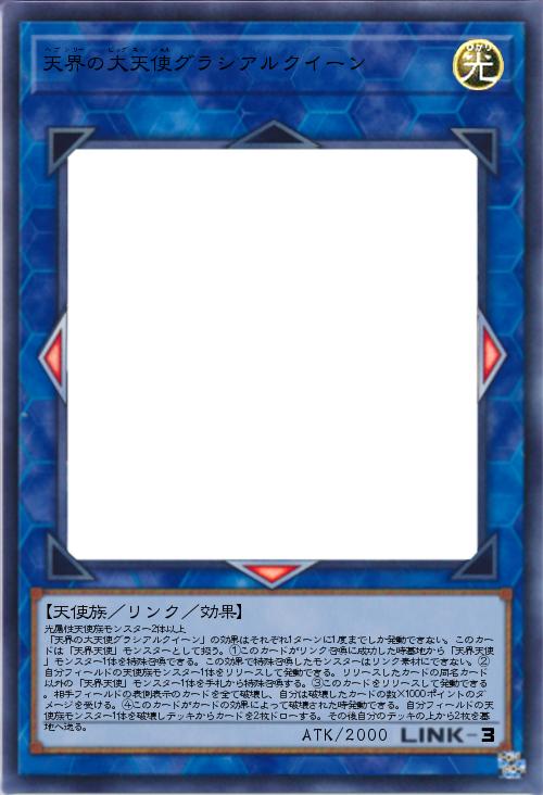 | 光属性天使族モンスター2体以上 「天界の大天使グラシアルクイーン」の効果はそれぞれ1ターンに1度までしか発動できない。このカードは「天界天使」モンスターとして扱う。①このカードがリンク召喚に成功した時墓地から「天界天使」モンスター1体を特殊召喚できる。この効果で特殊召喚したモンスターはリンク素材にできない。②自分フィールドの天使族モンスター1体をリリースして発動できる。リリースしたカードの同名カード以外の「天界天使」モンスター1体を手札から特殊召喚する。③このカードをリリースして発動できる。相手フィールドの表側表示のカードを全て破壊し、自分は破壊したカードの数×1000ポイントのダメージを受ける。④このカードがカードの効果によって破壊された時発動できる。自分フィールドの天使族モンスター1体を破壊しデッキからカードを2枚ドローする。その後自分のデッキの上から2枚を墓地へ送る。 | |||