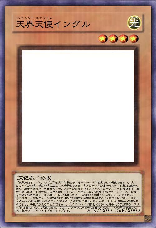 | 「天界天使イングル」の①と②と③の効果はそれぞれ1ターンに1度までしか発動できない。①このカードが召喚・特殊召喚に成功した時発動できる。自分のデッキの上からカードを3枚を墓地へ送り、墓地へ送った「天界天使」モンスターの数まで相手フィールドのモンスターを破壊する。墓地へ送ったカードの中に「天界天使」モンスターが存在しない場合自分の手札・フィールドのカードを全て持ち主のデッキに戻し、自分は戻したカードの数×500ポイントのダメージを受ける。②このカードが相手ターンの戦闘または相手の効果で破壊される場合、代わりに自分のデッキの上からカードを3枚墓地へ送ることができる。この効果で墓地へ送ったモンスターは墓地から特殊召喚できず、手札に加えることができない。③このカードが墓地へ送られた時手札の天使族モンスター2体を墓地へ送って発動できる。自分のデッキの上から4枚を墓地へ送る。この効果を使用した次の自分 | |||