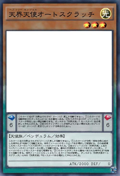 | このカード名の効果はそれぞれ1ターンに1度しか発動できない。①このカードが召喚・特殊召喚に成功した時手札を1枚捨てて発動できる。相手フィールドのモンスター1体を選択して破壊する。その後破壊したモンスターのレベル×300ポイントのダメージを与える。②自分フィールドの「天界天使」と名のつくPゾーンのカード1枚デッキに戻して発動できる。墓地の天使族モンスター1体をデッキに戻し、フィールドのリンクモンスターを全て破壊する。③このカードがデッキから墓地へ送られた時手札を1枚捨てて発動できる。相手フィールドにセットされているカード1枚を破壊し、デッキから「天界天使オートスクラッチ」以外の「天界天使」Pモンスター1体を選択して手札に加える。 | |||