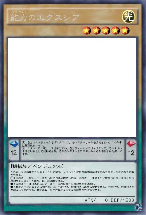| このカードは通常Pモンスターとして扱う。レベル11がP召喚可能な場合のみEXデッキからのP召喚ができる。 ①:このカードがEXデッキからのP召喚に成功した時、このカードは星11/攻3000/守3500の効果モンスターとなり、以下の効果を得る。 ●:このカードは「エクスシア」カード以外のカードの効果を受けない。 ●:相手メインフェイズに相手モンスターが召喚、特殊召喚した時に発動できる。その召喚、特殊召喚を無効にして除外する。相手はLPを半分払うことでこの効果を無効化できる。 | |||