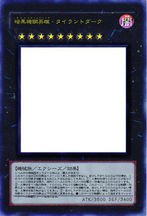 | レベル9の機械族モンスター2体以上(最大5体まで) このカード名の②の効果は1ターンに1度しか使用できない。自分LPが1000以下の場合、このカードの効果を発動するためにLPを払わなくても良い。①:X素材を持つこのカードが自分フィールドに存在する限り、相手フィールドのモンスターの攻撃力・守備力は2000ダウンする。②:X素材を1つ取り除き、1000LP払って発動できる。このターン、このカードは戦闘・効果によって破壊されない。この効果は相手ターンでも発動でき、自分LPが2000より少ない場合、X素材を取り除かなくても良い。③:自分LPが500よりも少ない場合、相手フィールドの効果モンスターの効果は以下の効果に変更される。●このカードの戦闘によって発生するコントローラーへの戦闘ダメージは倍になる。 | |||