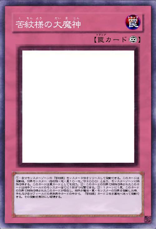 | ①:自分モンスターゾーンの「苦紋様」モンスター3体をリリースして発動できる。このカードは発動後、効果モンスター(岩石族・地・星10・攻/守3000)となり、モンスターゾーンに特殊召喚する。このカードは罠カードとしても扱う。②:このカードの効果で特殊召喚されたこのカードは相手フィールドのモンスター全てに1回ずつ攻撃できる。③:1ターンに1度、このカードの効果で特殊召喚されたこのカードが存在し、相手が魔法・罠・モンスターの効果を発動した時、手札及び自分フィールドの表側表示カードの中から、「苦紋様」カード2枚を墓地へ送って発動できる。その発動を無効にし破壊する。 | |||