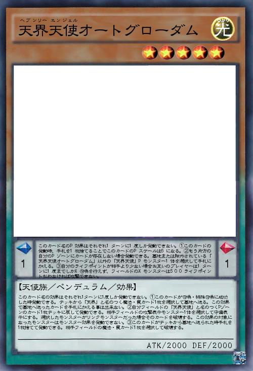 | このカード名のP効果はそれぞれ1ターンに1度しか発動できない。①このカードの発動時、手札を1枚捨てることでこのカードのPスケールは6になる。②もう片方の自分のPゾーンにカードが存在しない場合発動できる。墓地または除外されている「天界天使オートグローダム」以外の「天界天使」Pモンスター1体を選択して手札に加える。③自分のライフポイントが相手より少ない場合お互いのプレイヤーは1ターンに1度までしかX召喚を行えず、フィールドのXモンスターは500ライフポイント払わなければ攻撃できない。 | |||