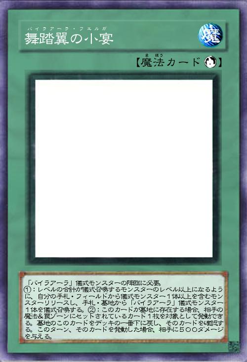 | 「バイラアーラ」儀式モンスターの降臨に必要。 ①:レベルの合計が儀式召喚するモンスターのレベル以上になるように、自分の手札・フィールドから儀式モンスター1体以上を含むモンスターリリースし、手札・墓地から「バイラアーラ」儀式モンスター1体を儀式召喚する。②:このカードが墓地に存在する場合、相手の魔法&罠ゾーンにセットされているカード1枚を対象として発動できる。墓地のこのカードをデッキの一番下に戻し、そのカードを確認する。このターン、そのカードを発動した場合、相手に500ダメージを与える。 | |||