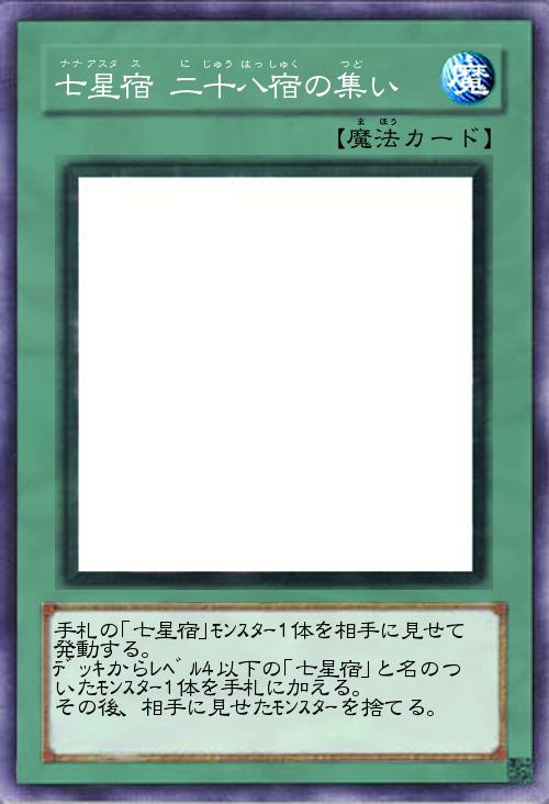 | 手札の「七星宿」モンスター1体を相手に見せて発動する。 デッキからレベル4以下の「七星宿」と名のついたモンスター1体を手札に加える。 その後、相手に見せたモンスターを捨てる。 | |||