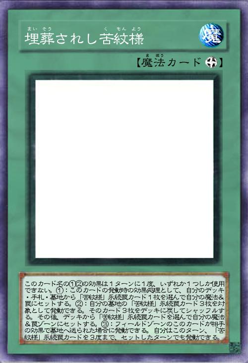 | このカード名の①②の効果は1ターンに1度、いずれか1つしか使用できない。①:このカードの発動時の効果処理として、自分のデッキ・手札・墓地から「苦紋様」永続罠カード1枚を選んで自分の魔法&罠にセットする。②:自分の墓地の「苦紋様」永続罠カード3枚を対象として発動できる。そのカード3枚をデッキに戻してシャッフルする。その後、デッキから「苦紋様」永続罠カードを選んで自分の魔法&罠ゾーンにセットする。③:フィールドゾーンのこのカードが相手の効果で墓地へ送られた場合に発動できる。自分はこのターン、「苦紋様」永続罠カードを3度まで、セットしたターンでも発動できる。 | |||