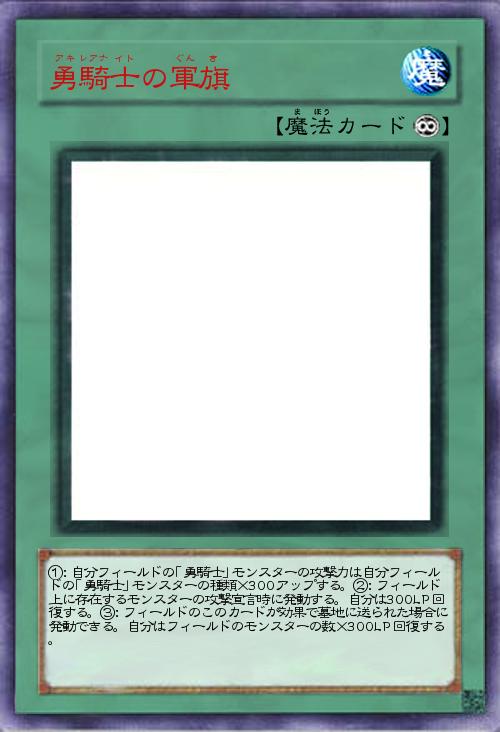 | ①:自分フィールドの「勇騎士」モンスターの攻撃力は自分フィールドの「勇騎士」モンスターの種類×300アップする。②:フィールド上に存在するモンスターの攻撃宣言時に発動する。自分は300LP回復する。③:フィールドのこのカードが効果で墓地に送られた場合に発動できる。自分はフィールドのモンスターの数×300LP回復する。 | |||