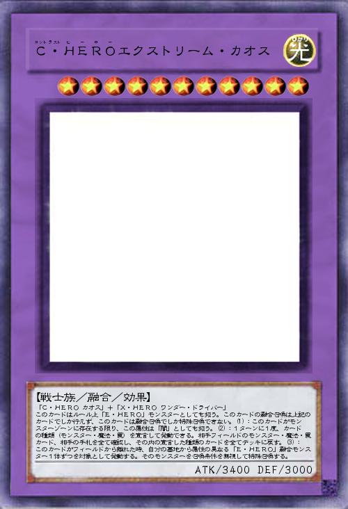 | 「C・HERO カオス」+「X・HERO ワンダー・ドライバー」 このカードはルール上「E・HERO」モンスターとしても扱う。このカードの融合召喚は上記のカードでしか行えず、このカードは融合召喚でしか特殊召喚できない。(1):このカードがモンスターゾーンに存在する限り、この属性は「闇」としても扱う。(2):1ターンに1度、カードの種類(モンスター・魔法・罠)を宣言して発動できる。相手フィールドのモンスター・魔法・罠カード、相手の手札を全て確認し、その内の宣言した種類のカードを全てデッキに戻す。(3):このカードがフィールドから離れた時、自分の墓地から属性の異なる「E・HERO」融合モンスター1体ずつを対象として発動する。そのモンスターを召喚条件を無視して特殊召喚する。 | |||
