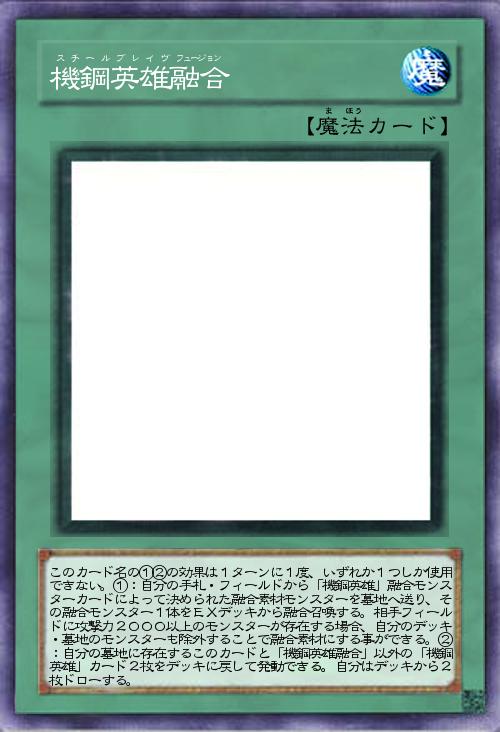 | このカード名の①②の効果は1ターンに1度、いずれか1つしか使用できない。①:自分の手札・フィールドから「機鋼英雄」融合モンスターカードによって決められた融合素材モンスターを墓地へ送り、その融合モンスター1体をEXデッキから融合召喚する。相手フィールドに攻撃力2000以上のモンスターが存在する場合、自分のデッキ・墓地のモンスターも除外することで融合素材にする事ができる。②:自分の墓地に存在するこのカードと「機鋼英雄融合」以外の「機鋼英雄」カード2枚をデッキに戻して発動できる。自分はデッキから2枚ドローする。 | |||