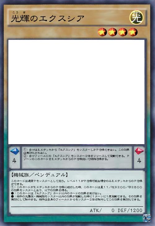 | このカードは通常Pモンスターとして扱う。レベル11がP召喚可能な場合のみEXデッキからのP召喚ができる。 ①:このカードがEXデッキからのP召喚に成功した時、このカードは星11/攻3200/守2800の効果モンスターとなり、以下の効果を得る。 ●:このカードは「エクスシア」カード以外のカードの効果を受けない。 ●:相手の光属性・機械族モンスター以外の効果が発動した時に1ターンに1度発動できる。その効果を無効にして除外する。相手は自身のフィールドからモンスター2体を除外してこの効果を無効化できる。 | |||